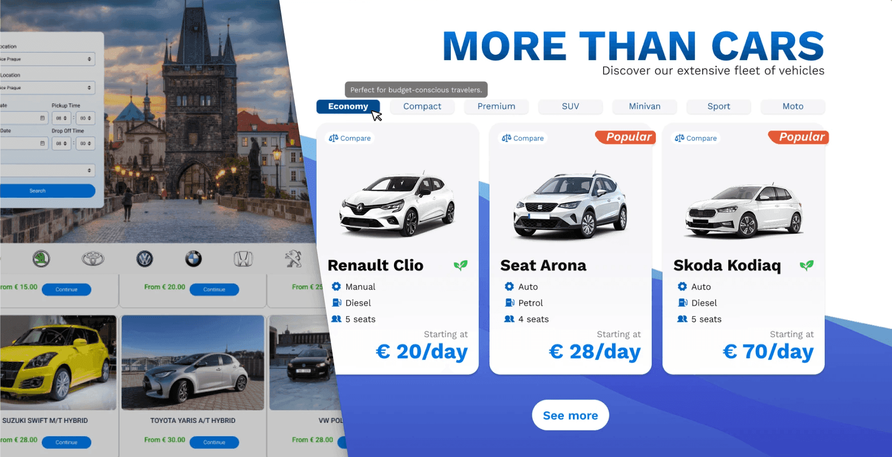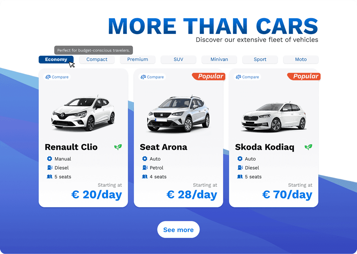 Each card shows exactly what a user needs to decide: vehicle type, fuel, transmission, seat count, daily price. Nothing else. Popular vehicles are marked visually. On desktop, secondary actions appear on hover to keep the card clean. On mobile, they're always visible.