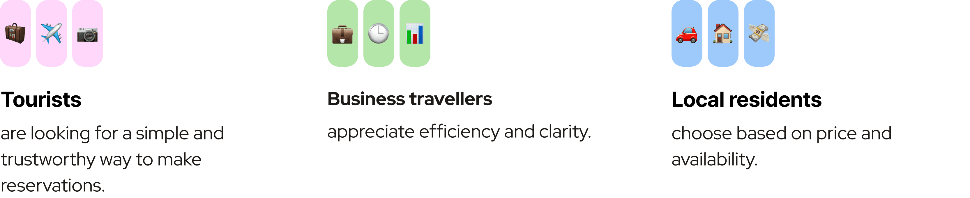 The site serves tourists looking for a simple mobile booking experience, business travelers who want speed, and locals comparing prices before committing. All three were let down by the same things: a form that was hard to scan, cards with inconsistent information, no clear visual hierarchy.