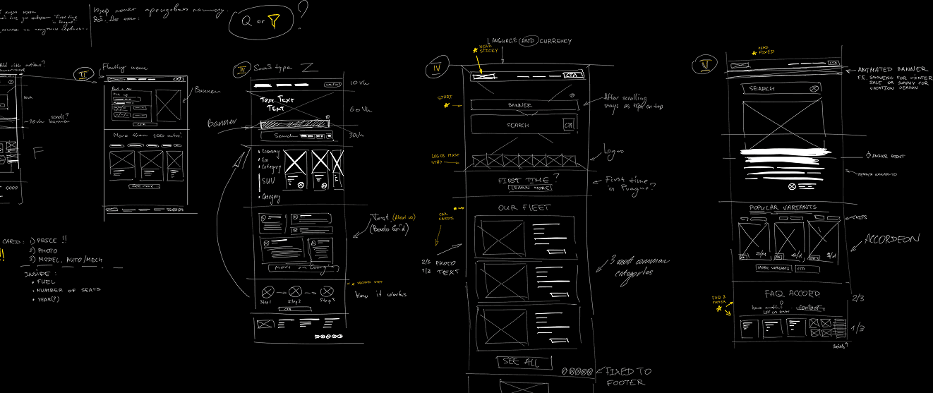 I started with wireframes, not visuals. The homepage used a Z-pattern to guide attention from the headline through the search form to vehicle cards. The booking form followed an F-pattern — how eyes naturally move through input-heavy layouts.