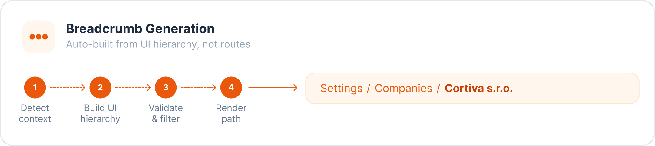 For the third level of hierarchy, three consecutive tab bars would have been too much. I resolved this through breadcrumbs and documented the logic for when and how to use them: show only on inner pages at depth ≥ 2, never duplicate the page title, never replace the back button, don't reflect technical route parameters.
