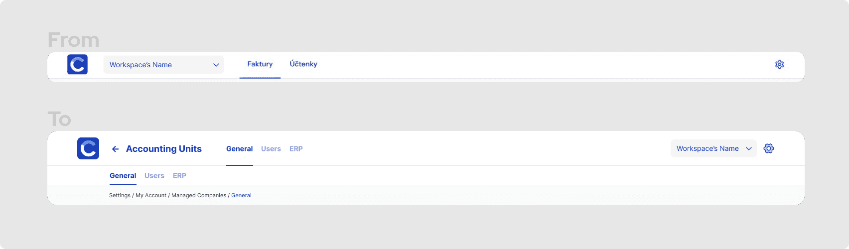 On the right side of the top bar: Settings and the Workspace selector. On the left: the logo (always returns to the main dashboard) and a Back button that appears only on nested views — not as a replacement for breadcrumbs, but as a semantic one-level-up action.