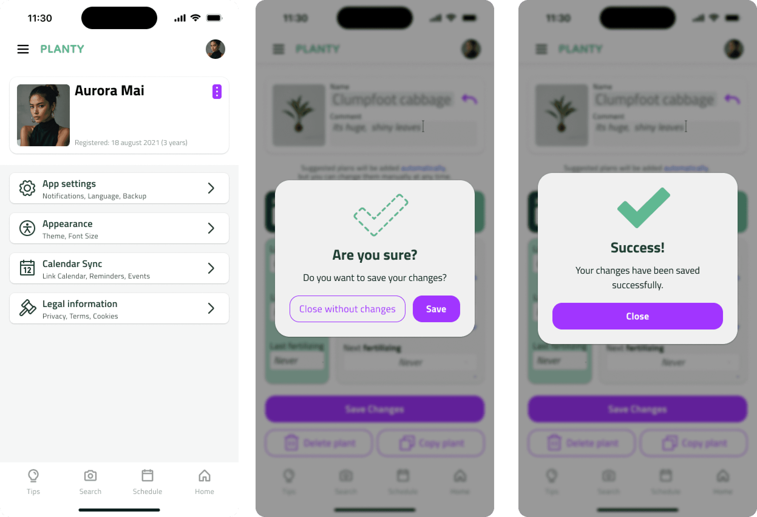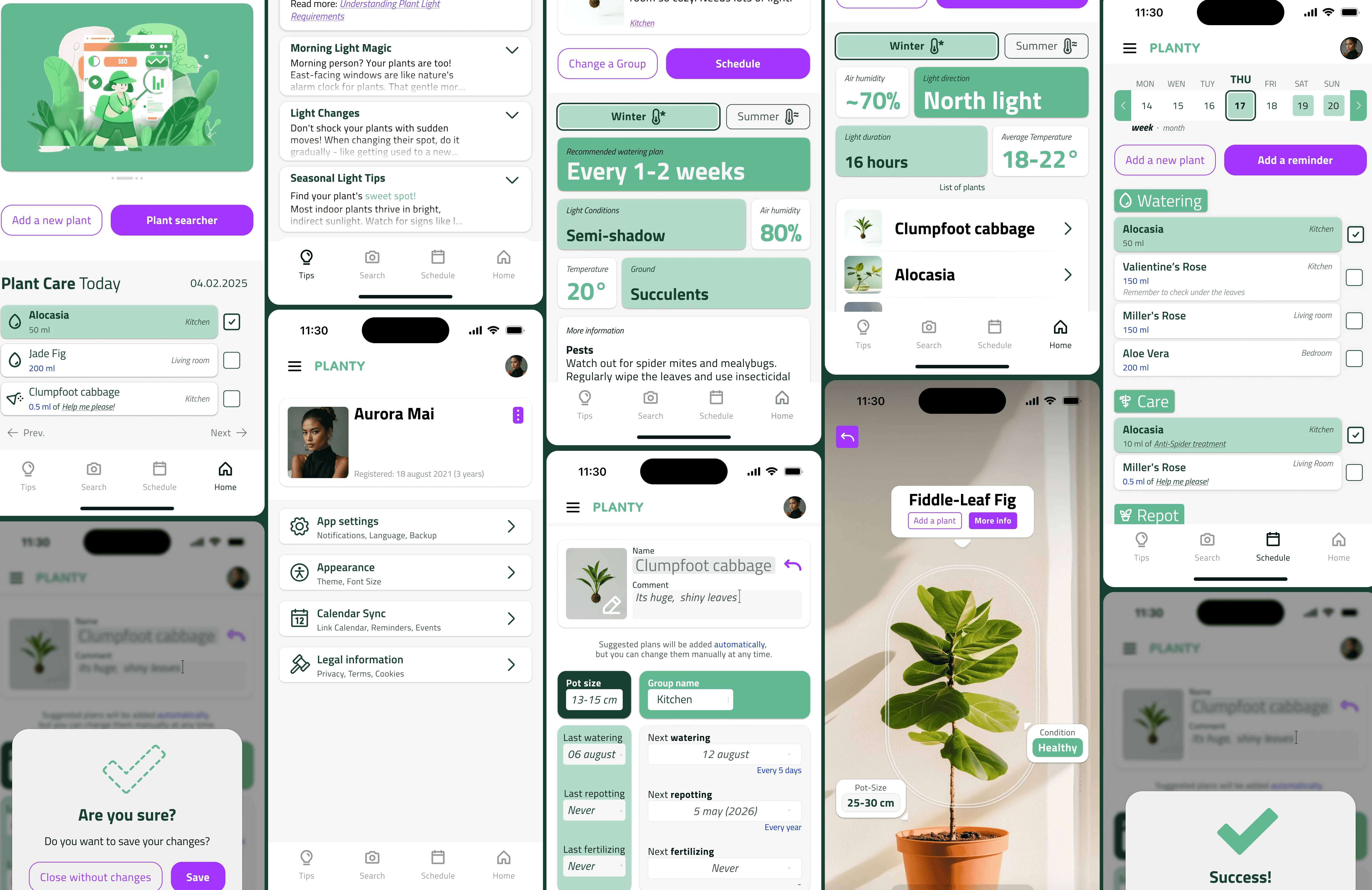 I storyboarded both personas' journeys before touching Figma. Then mapped the information architecture: three main sections (Tips, My Plants, Settings), each with their own decision trees. The reminder flow — Olly's core use case — was mapped in detail before a single wireframe was drawn.