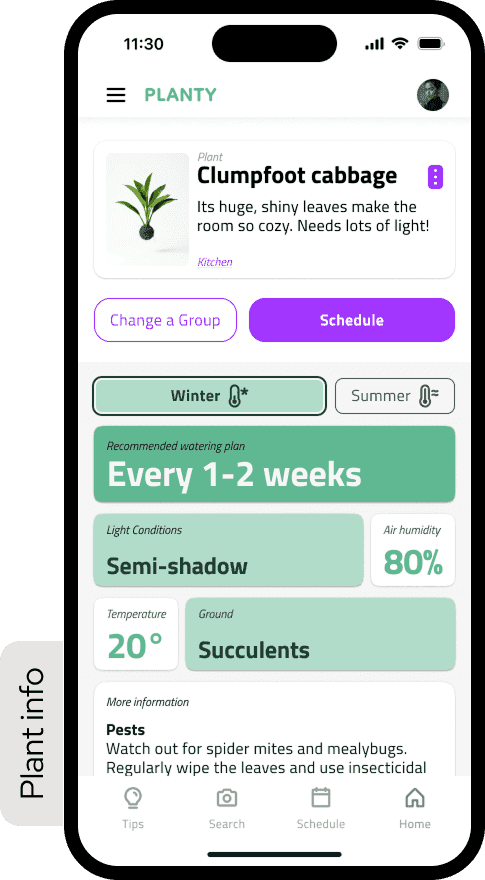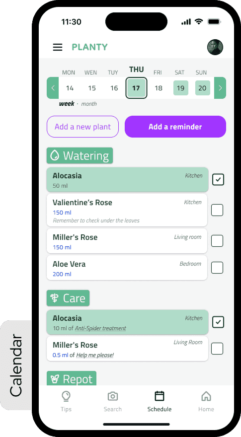 Reminder entry point. Moved from a secondary menu to a visible action directly on the plant detail screen. Maximum two taps from anywhere in the app.