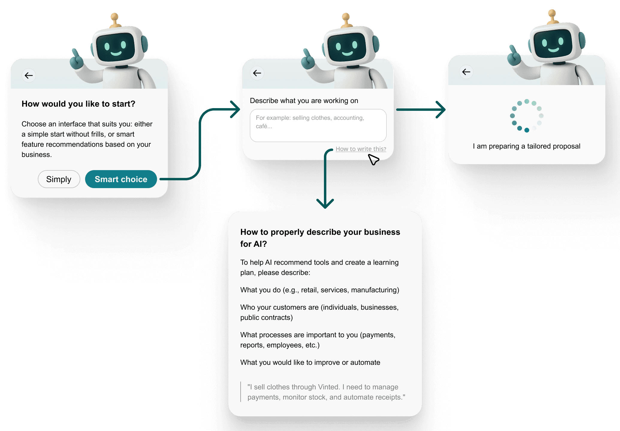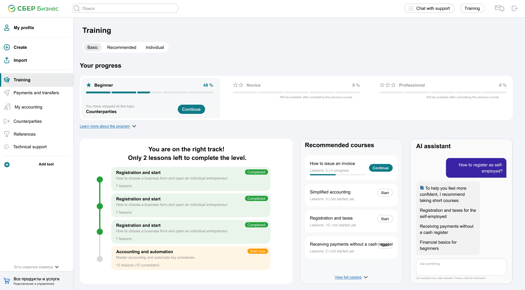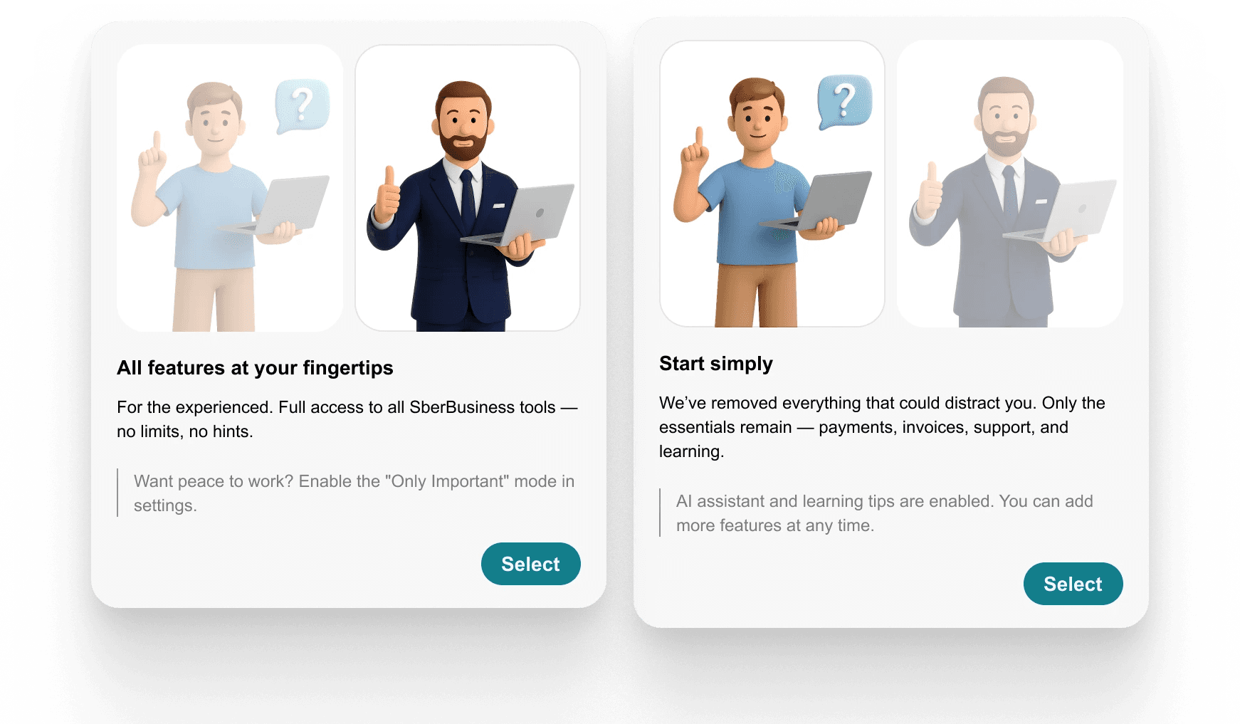 The original SberBusiness had none. I designed a modular flow: the user chooses between guided or manual setup, describes their business in plain language, and receives a personalised set of tools and learning suggestions.