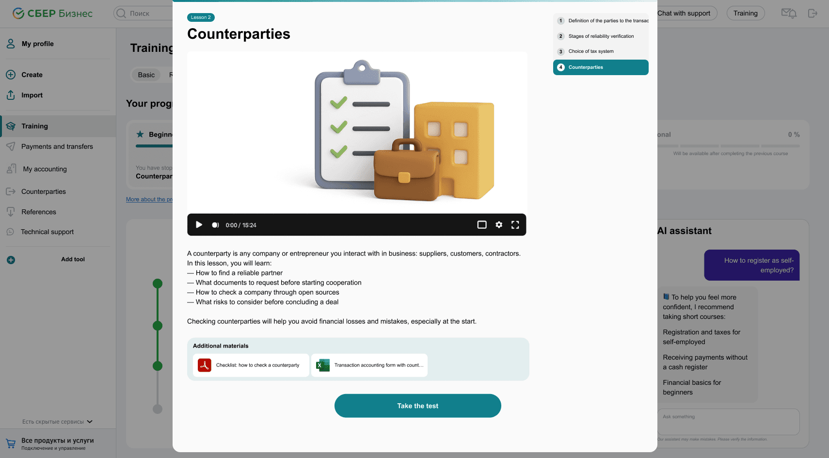 Each lesson includes a short video, a text summary, key takeaways, downloadable materials, and a quick test. Designed to replace the need for an external accountant or consultant for basic questions.