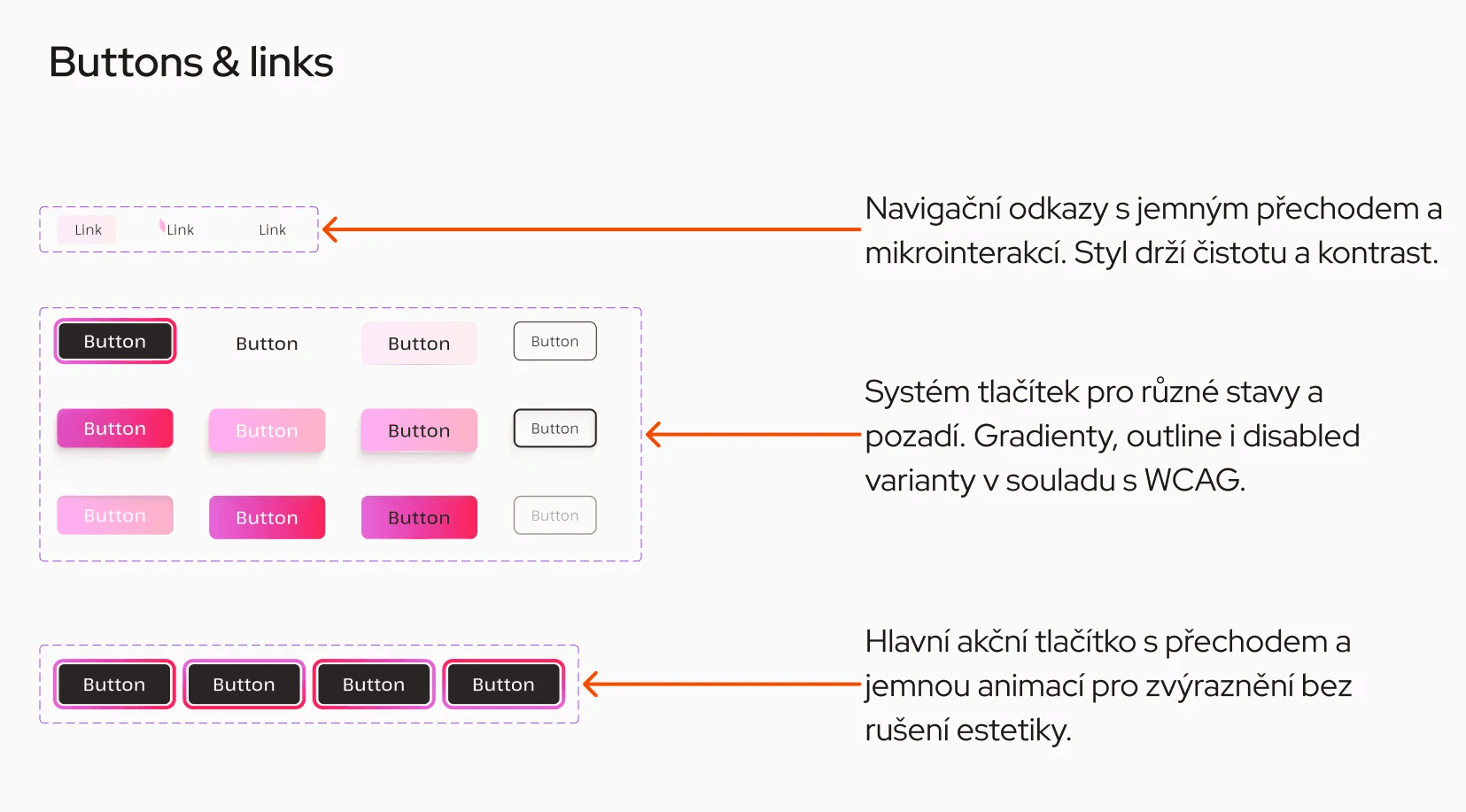 Buttons: gradient CTAs, outline states, and muted disabled versions — all WCAG-consistent