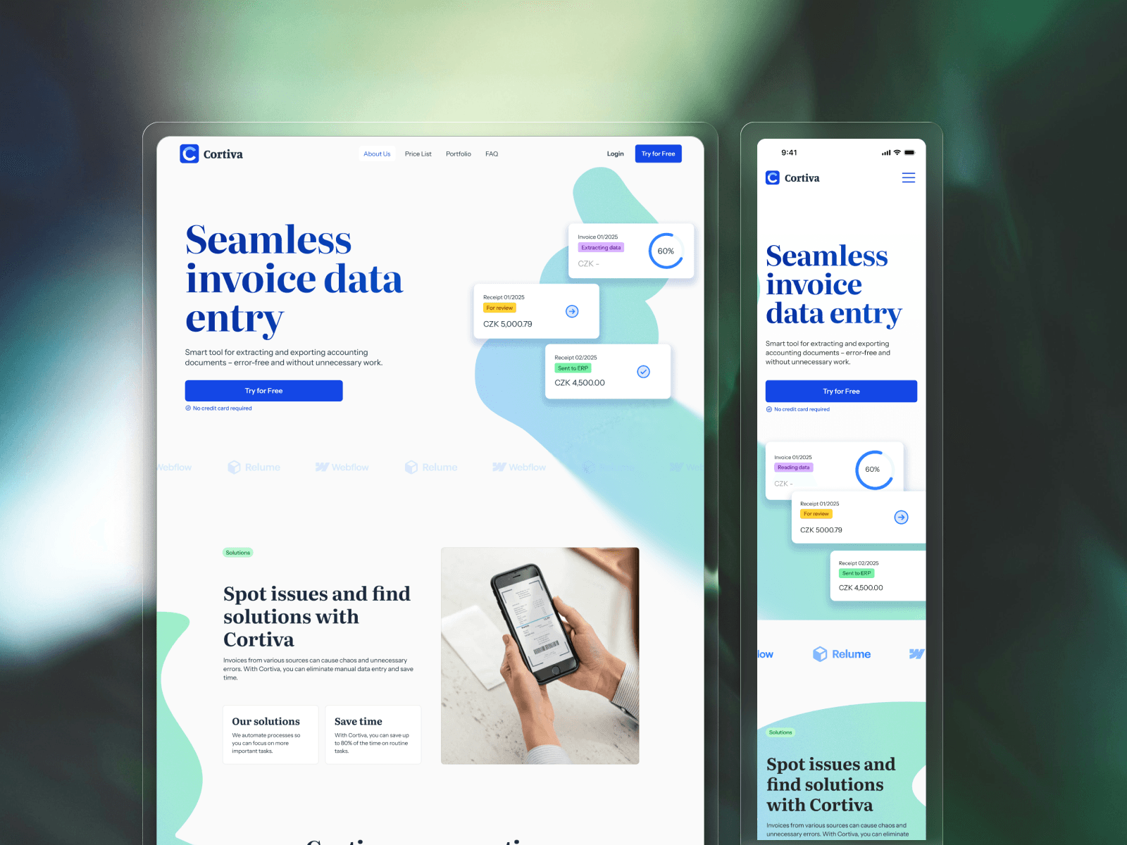 Webdesign pro B2B softwarový produkt. Kompletní design systém v Figma — responzivní layouty, komponenty, onboarding flow. Předán vývojářskému týmu k implementaci.